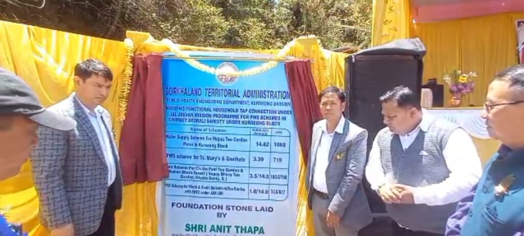 खरसाङ (निसं) : खरसाङ चिम्नी देउराली समष्टिमा आज जल जीवन मिशन अन्तर्गत हर घर जल योजनाको शिलान्यास जीटीए चिफ् अनित थापाले गरेका छन्। यस योजनाले 3,410 घरलाई पिउने पानी उपलब्ध गराउने भएको छ। यस योजनाको कुल लागत रु 47.51 करोड रहेको छ। खरसाङ चिम्नी देउराली समष्टिमा शिलान्यास गरिएको जल जीवन मिशनको योजना मजुवा चिया बगानमा 1060 घरको निम्ति 14.62 करोड, सेन्ट मेरीस अनि गोथल्स क्षेत्रमा 715 घरको निम्ति 3.39 करोड, चैते पानी चिया बगानका 180 घरको निम्ति 3.5 करोड, बामन धुरा फरेस्ट का 768 घरको निम्ति 14.5 करोड , उत्तर शिव खोलाका 50 घरको निम्ति 1 करोड अनि दक्षिण शिव खोलाका 637 घरको निम्ति 14 करोड राशी आवन्टन गरिएको बताइएको छ।