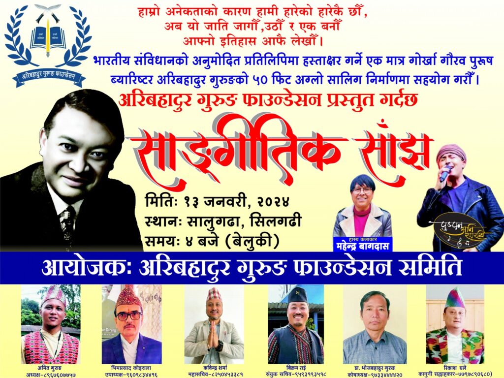 सिलगढी (निसं): ब्यारिस्टर अरिबहादुर गुरूङको पचास फिटे सालिग निर्माणार्थ कोष बटुल्न सिलगढीको सालुगढामा भोली 13 जनवरी साँझ 4 बजे सङ्गीतमय साँझको आयोजना गरिएको छ। ब्यारिस्टर अरिबहादुर गुरूङ फाउन्डेशनको तत्वावधानमा आयोजित कार्यक्रममा चर्चित गायक पुष्पण प्रधान लगायत जेत्सन डोमा, जुनु गौतम अनि अरू प्रतिष्ठित कलाकारहरूले गीत प्रस्तुत गर्ने छन्। यसरी नै चर्चित नृत्यकारहरूले रमाइला प्रस्तुती दिनेछन्। यति मात्र नभई चर्चित हाँस्य कलाकार महेन्द्र बागदासले पनि उपस्थित दर्शवर्गलाई मनोरञ्जन दिनेछन्। स्मरण गराइन्छ, ब्यारिस्टर अरिबहादुर गुरूङ फाउन्डेशनको मुख्य समितिमा अध्यक्ष अमित गुरूङ, उपाध्यक्ष भीमप्रसाद कोइराला, महासचिव कबीन्द्र शर्मा, संयुक्त सचिव बिक्रम राई, कोषाध्यक्ष डा. भोजराज गुरूङ, कानूनी सल्लाहकार रिकाश घले रहेका छन्। यही समितिको पहलमा खरसाङको सिटोङमा ब्यारिस्टर अरिबहादुर गुरूङको पचास फिटे सालिग स्थापित गरिने भएको छ।