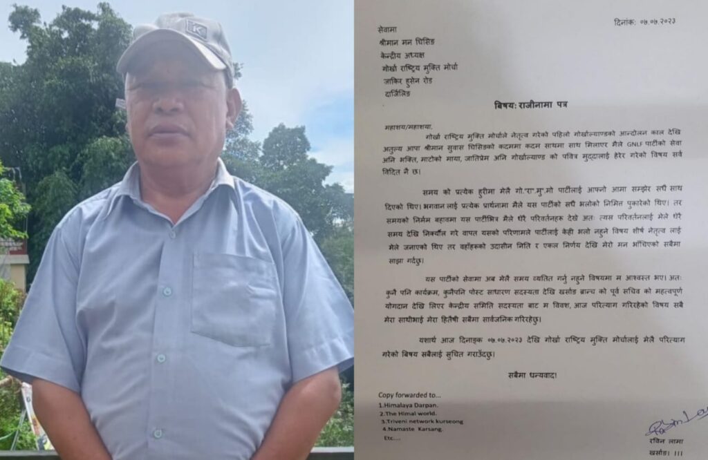 खरसाङ (निसं): पञ्चायत चुनाउको ठीक एक दिन अघि आज शुक्रबार गोर्खा राष्ट्रिय मुक्ति मोर्चाका संस्थापक सदस्य तथा खरसाङ ब्राञ्चका पूर्व सचिव रबीन लामाले पार्टी अनि साधारण सदस्यताबाट पनि राजीनामा दिएका छन्। तिनले एउटा प्रेष विज्ञप्ति मार्फत यसबारे जानकारी गराएका छन्। तिनले राजीनामा दिनुको मुख्य कारण पार्टीका शीर्ष नेतृत्वहरूले कुनै पनि कार्य गर्दा एकल निर्णय लिइने गरेकोले गर्दा नै तिनको पार्टीबाट भरोसा उडेको बताएका छन्। लामाले आफू गोरामुमो पार्टीमा संस्थापक अध्यक्ष सुवास घिसिङ अनि पार्टीको सिद्धान्तलाई हेरेर आजसम्म पार्टीमा रहेको भए तापनि आजपर्यन्त पार्टीमा त्यो नरहेको जनाएका छन्।
