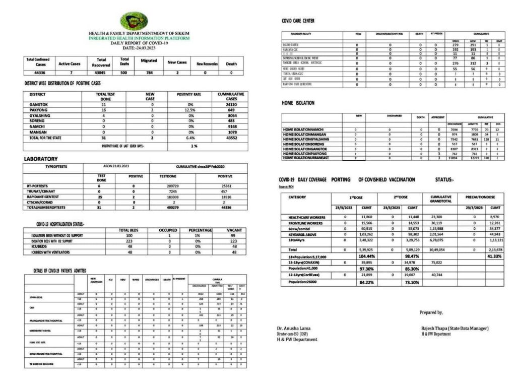 गान्तोक: सिक्किम राज्यमा कोरोनाको दुई नयाँ मामिला फेला परेको राज्यको स्वास्थ्य एवम् परिवार कल्याण विभागद्वारा जारी दैनिक हेल्थ रिपोर्टमा जानकारी गराइएको छ। उक्त रिपोर्ट अनुसार, दुई नयाँ मामिला राज्यको पाकिम जिल्लाबाट फेला परेको छ। मोठ 31 नमूनाको जाँच गर्दा उक्त दुई नयाँ मामिला फेला परेको हो, जसमध्ये पाकिम जिल्लाबाट 16 वटा नमूनाको जाँच गरिएको थियो। उक्त 2 नयाँ मामिला पछि अब सिक्किम राज्यमा कोरोनाको सक्रिय मामिला 7 पुगेको छ। राज्यमा केही दिनदेखि कोरोनाको नयाँ मामिला आंशिक रूपमा देखा परेपछि गत एकक हप्ताको अवधि कोरोनाको पोजिटिभिटी दर 1 प्रतिशत पुगेको छ। कोरोना शुरु भएदेखि हालसम्म सिक्किममा मोठ 44 हजार 336 जना संक्रमित भइसकेका छन् भने 43 हजार 45 जना कोरोनामुक्त भइसकेका छन्। यसको साथै कोरोना भाइरसले प्राण गुमाउनेहरूको संख्या हालसम्म 500 जना पुगिसकेको छ।