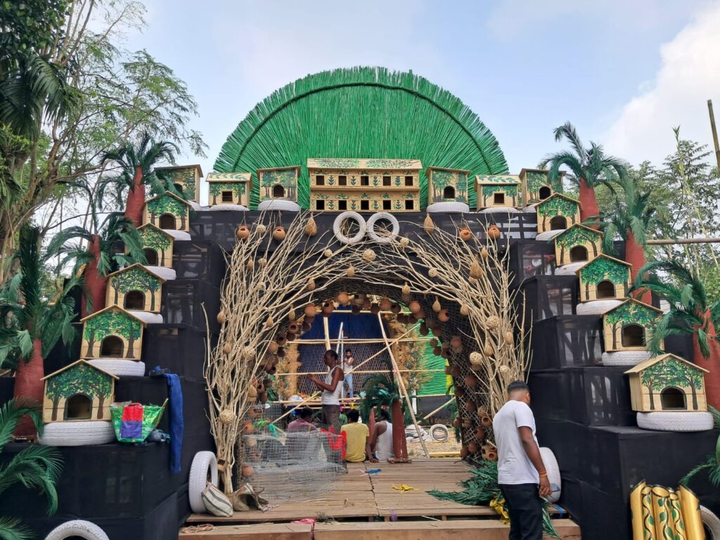 हाल पूजाको अन्तिम तयारी चलिरहेको छ। पूजा मण्डप जूट, माटोका हाड्डी, काशफूल, बाँस, पराल र विभिन्न सामग्रीबाट बनाइँदैछ। यस विषयमा पूजा आयोजकहरूले भने, एक समय गाउँमा विभिन्न प्रजातिका चराहरू देखिन्थे। हालको समयमा ती चरा विलुप्त भएका छन्। वर्तमान पिँढीलाई यस थिममार्फत चराहरू कसरी अस्तित्वमा छन् र चराहरूले गुडँ कसरी बनाउँछन् भन्ने देखाइएको छ। यसको साथै, हाल चराचरूङ्गीहरूको अस्तित्व संकटमा आइरहेको कुरालाई ध्यानमा राख्दै दर्शकहरूका लागि चराप्रति जागरूकता ल्याउने उद्देश्यले गरिएको हो।