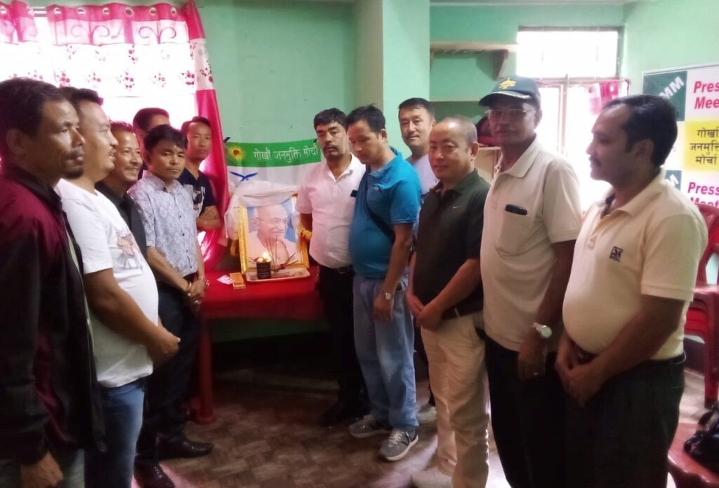 मिरिक (निसं) गोर्खा जनमुक्ति मोर्चा मिरिक महकुमा समितिको आयोजनामा आज यहाँको पार्टी कार्यालयमा मुख्य सल्लाहकार अर्जुन आचार्यको अध्यक्षतामा राष्ट्रपिता महात्मा गान्धीको 154 ओै जन्म जयन्ती पालन गरियो। यस अवसरमा गोजमुमो मिरिक महकुमा संयोजक अभिषेक श्रेष्ठ, उपाध्यक्ष विजय लेप्चा, मिरिक थर्बु डुप्टिन समष्टि महासचिव रामचन्द्र राई लगायत चारवटा समष्टिको पार्टीका समर्थकहरू उपस्थित थिए। कार्यक्रमको शुरूमा उपस्थित सबैले राष्ट्रपिता महात्मा गान्धीको फोटो अघि फुलको गुच्छा, खदा-माला चढाएर दीप प्रज्वलन गरेर तिनलाई स्मरण गर्दै श्रद्धाञ्जलु अर्पण गरे। यस अवसरमा भारतलाई ब्रिट्रिश शासकहरूबाट स्वतन्त्रता दिलाउन महात्मा गान्धीले दिएको अमूल्य योगदान अनि तिनले देश स्वतन्त्रताको लागि गरेका विभिन्न आन्दोलनबारे वक्ताहरूले प्रकाश पारे। स्मरण रहोस, गोर्खा जनमुक्ति मोर्चाले आफ्नो स्थापनाकालदेखि नै गान्धी जयन्ती पालन गर्दै आइरहेको छ।