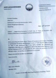 दार्जिलिङ (निसं) : जीटीए सभाको नियमको कतिपय बुँदाहरूमा संशोधन गरिनु पर्ने सुझाउ दिँदै हाम्रो पार्टी अध्यक्ष तथा सभासद अजय एडवाडर्सले जीटीए चेयरम्यान अन्जुल चौहवानलाई पत्र पटाएका छन्। गत केही दिन अघि जीटीए सभाको तेस्रो सभामा जीटीए सभाको सञ्चालनको लागि तयारी गरिएको नियम पत्रको प्रतिलिपि सबै समष्टीका निर्वाचित सभासदहरूको हात-हातमा सुम्पिएको थियो भने उक्त जीटीए नियम पत्रको बुँदाहरूको अध्यायन गरेर आगामी 25 अप्रेलसम्म कसैले पनि सुझाउ तथा प्रतिक्रिया दिनसक्ने अनुरोध गरिएको थियो।