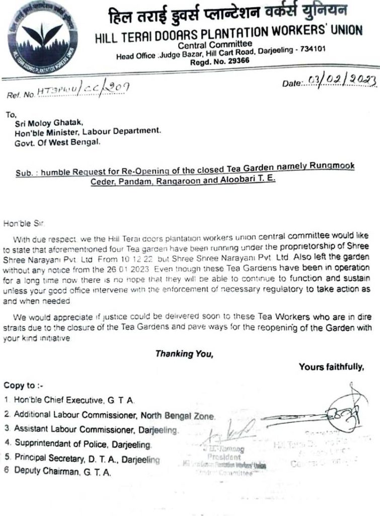 दार्जिलिङ : जोइन्ट फोरमले हस्तक्षेपको माग गर्दै राज्यको श्रम मन्त्री मलय घटकलाई पत्र लेखेको छ। गत 8 दिसम्बर 2022 को दिन जीटीए मुख्यालय लाल कोठीमा जीटीए सभाको पदाधिकारीहरूको उपस्थितिमा पहाडको सत्ता पक्ष श्रमिक संगठनले श्री नाराणी कम्पनीलाई पहाडको चारवटा चिया बगान रम्बुक सिर्डर, राँगेरूङ, नागरी, आलुबारी चिया बगानको सम्झौता पत्रमा हस्ताक्षर गरेको केही दिनदेखि नै ती चिया बगानहरू सञ्चालन गरेका थिए तर केही महिनाहरू नबित्दै यी चिया बगानहरूमा कार्यरत श्रमिकहरूले रोजी लगायत अन्य साहुलियतहरू नपाएको जोइन्ट फोरमले श्रम मन्त्री घटकलाई लेखेको पत्रमा उल्लेख गरेको बताइएको छ। यी चिया बगानहरूमा प्रबन्धकदेखि लिएर कर्मचारीहरू एवम् श्रमिकहरू अझ पनि कार्यरत छन तर उनीहरूले पाउनु पर्ने रोजी, वेतन आदि केही नपाएको एडवार्डस फाउन्डेसनको मिडिया सेलले जनाएको छ। यसैबीच, पहाडको सत्तापक्षको श्रमिक संगठन हिल तराई डुवर्स प्लान्टेशन वर्कर्स युनियनले 26 जनवरीदेखि बगानको मालिकवर्गले कुनै सूचना नदिइ बगान छोडेर गएको अवगत गराउँदै श्रम मन्त्रालयलाई पत्राचार गरेर हस्ताक्षेपको मांग गरेको जोइन्ट फोरमले आफ्नो पत्रमा उल्लेख गरेको छ। जोइन्ट फोरमले शुरूदेखि नै सम्झौता गलत रहेको बताउँदै आइरहेको थियो भने त्यसै अनुरूप सम्झौता बैठकमा जोइन्ट फोरमको कुनै पनि श्रमिक संगठनको नेतृत्वहरूले अंश ग्रहण गरेका थिएनन्। सम्झौता गरेको केही महिना नबित्दै बगानको यस्तो अवस्था हुनु भनेको दुर्भाग्य रहेको जोइन्ट फोरमले बताएको छ। जोइन्ट फोरमले आफ्नो अडान स्पष्ट पार्दै यी चारवटा चिया बगानहरूमा कार्यरत कर्मचारीहरू साथै श्रमिकहरू आज पनि कार्यालय एवम् बगानमा कार्यरत छन, त्यसकारण यिनीहरूले गरेको कामको दाम सम्झौता बैठकमा उपस्थित रहेका जीटीए सभाको पदाधिकारी साथै श्रमिक संगठनले भुक्तान गर्नु पर्छ भनि बताएको छ। जोइन्ट फोरमले राज्यको श्रम मन्त्री मलय घटकलाई लेखेको पत्रमा शिघ्र श्रम मन्त्रालयले यस विषयमा हस्तक्षेप गर्नु पर्ने अनि कुनै राम्रो कम्पनीलाई त्रिपक्षीय सम्झौता गरेर सुम्पिनु पर्ने मांग पनि गरेको छ। पत्रको अन्तमा जोइन्ट फोरमले चिया श्रमिकहरूलाई बिचल्नी हुनदेखि जोगाउँने पुनः निवदेन गरेको छ।