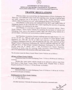 यसैगरी, रेली रोडदेखि मेन रोड, टुनि बोटेदेखि बिरोलो कोठी, जिल्ला अस्पताल मोडदेखि जिल्ला अस्पतालसम्म बिहान 7:30 देखि बेलुकी 5:30 सम्म (आइतबार बाहेक) अरु दिन पानीको गाडी हाल्न प्रतिबन्ध लगाइएको छ। यसवाहेक, ठूलो सामान बोक्ने ट्रकहरु बिहान 7:30 देखि 11:30 सम्म र अपरान्ह 2:30 देखि 4:30 सम्म (आइतबार बाहेक) अन्य दिन शहरमा पस्न निषेध गरिएको कालेबुङ ट्राफिक सीत्रले जनाएको छ।