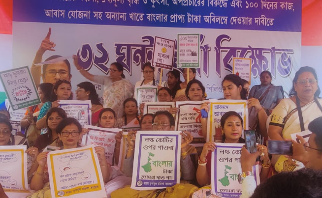 सिलगढी : केन्द्र सरकारको विरोधमा कोलकातापछि सिलगढीमा पनि तृणमूल महिला कङ्ग्रेसले आज 32 घण्टा धरना कार्यक्रम पालन गर्यो। आज तृणमूल महिला कङ्ग्रेसका राज्य अध्यक्ष चन्द्रिमा भट्टाचार्य र सांसद माला राय पनि उक्त कार्यक्रममा सामेल थिइन्। तृणमूल महिला कङ्ग्रेसका सदस्यहरूले हातमा प्लाकार्ड बोकेर केन्द्र सरकारविरुद्ध प्रदर्शन गरे। धरना मञ्चबाट 100 दिनको काम तथा आवास योजना सहित विभिन्न मागहरूलाई लिएर तृणमूल महिला कङ्ग्रेसका सदस्यहरूले प्रदर्शन गरे। यस सम्बन्धमा चन्द्रिमा भट्टाचार्यले भनिन्, केन्द्रले गर्दा राज्यले आर्थिक कमजोरीको सामना गर्न परिरहेको छ। केन्द्र सरकारले बकाया राशि चाँडोभन्दा चाँडो दिनुपर्छ।