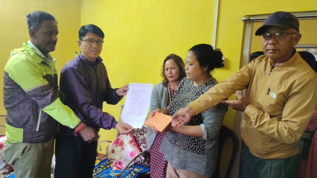 खरसाङ (निसं) : खरसाङको बरबुङ निवासी 4 वर्षीय नानी समीर शेर्पा ब्रेनको रोगले ग्रसित भएकोले गर्दा तिनको उपचारको लागि ‘नमस्ते खरसाङ ’-को पहलमा आर्थिक सहयोग सङ्कलन गरिरहेको छ। यसै क्रममा नमस्ते खरसाङको प्रबन्ध निर्देशक निर्मल गुरुङ, भोला रावत लगायत अन्य बरबुङस्थित समीर शेर्पाको घरमा पुगेर सङ्कलन भएको मोठ 32 हजार 8 सय रुपियाँ परिवारलाई प्रदान गरिएको बताइएको छ। नमस्ते खरसाङको पक्षमा निर्मल गुरुङले 32 हजार 8 सय सहित प्रदान गर्नेहरूको सूची बिमारीको आमालाई दिएका छन्। चार वर्षीय नानी समीर शेर्पाको उपचारको लागि हाल खरसाङ, दार्जिलिङ लगायत पहाड़, तराई डुवर्स साथै देश-विदेशमा आर्थिक सहयोग सङ्कलन भइरहेको निर्मल गुरुङले जानकारी दिएका छन्। तिनले बताए अनुसार बिमारी नानीको उपचारको लागि नानीलाई दुईपल्ट सिलगढी लगिएको साथै भेल्लोरको चाइल्ड स्पेसियलिस्टसित पनि भिडियो कलमार्फत बाचचित गरेपछि नानीको उपचारको लागि सल्लाह र सुझावहरू दिएको छ। नानीको उपचारको लागि नमस्ते खरसाङको पहलमा आगामी 15 अगस्तसम्म सहयोग सङ्कलन गरिने निर्मल गुरूङले बताएका छन्। यसको साथै नानीको उपचारको लागि सहयोग गरिदिने सबैप्रति नमस्ते खरसाङको पक्षबाट निर्देशक निर्मल गुरुङले आभार प्रकट गरेका छन्।