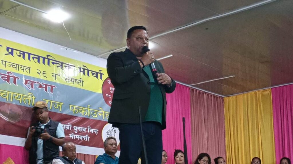 खरसाङ (निसं) : भारतीय गोर्खा प्रजातान्त्रिक मोर्चाको चुनावी सभा खरसाङको गौरी शंकर चियाबारीमा सम्पन्न भयो। उक्त चुनावी सभामा मुख्य वक्ताको रूपमा भारतीय गोर्खा प्रजातान्त्रिक मोर्चाका केन्द्रीय अध्यक्ष अनित थापा उपस्थित थिए। तिनले आफ्नो सम्बोधनमा यसपालीको चुनाउमा भागोप्रमोको जीत निश्चित रहेको बताए। हामीले सबैलाई सहयोग गरेका छौं। तर यसपालीको चुनाउमा पार्टीले टिकट दिएन भनेर कार्यकर्ताहरू निर्दलीय प्रार्थीको रूपमा खडा भएका छन्। वर्षभरि पार्टीले कार्यकर्ताहरूको सुनेको छ र चुनाउको बेला पार्टीको कुरा सुन्नु पर्ने थियो।