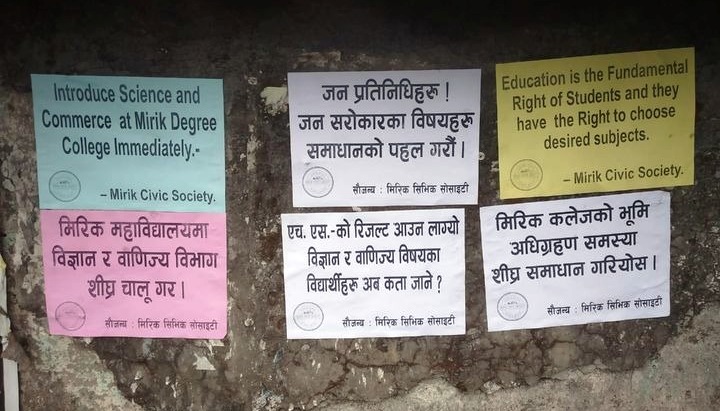 मिरिक (निसं): मिरिक सिभिक सोसाइटीले मिरिक महाविद्यालयमा विज्ञान र वाणिज्य विभागमा पनि पठन-पाठन गरिनु पर्ने माग गर्दै मिरिकमा व्यापक पोस्टरिङ गरेको छ। यसबारे सोसाइटीको पक्षबाट ग्याल्पो लामा अनि केसाङ लामाले बताए अनुसार मिरिक महाविद्यालयमा धेरै वर्ष अघिदेखि कला विभाग मात्र रहेको छ भने अब वर्तमान समयको माग अनुसार विज्ञान र वाणिज्य विभागमा पनि पढाइ गरिनु पर्छ। मिरिक क्षेत्रको उच्चत्तर विद्यालयहरूमा कलासँगै विज्ञान अनि वाणिज्य विभाग रहेकोले त्यहाँ यस विषयको पठन पाठन हुने गरे तापनि विज्ञान अनि वाणिज्य विभागमा अध्ययन गरेका यस क्षेत्रका विद्यार्थीलेहरूले मिरिक महाविद्यालयमा उक्त विभाग नभएको कारण समस्याको सामना गर्नु परिरहेको छ। विशेष गरेर मिरिक क्षेत्र अन्तर्गत धेरैवटा चियाबारी परेको कारण पनि यहाँका अभिभावकहरू आर्थिक रूपमा कमजोर रहेकोले मिरिक बाहिर आफ्नो नानीहरूलाई पढाउनु असमर्थ रहेको तिनीहरूले बताए। यसको साथै एघारौ अनि बाह्रौ श्रेणीमा विज्ञान र वाणिज्य विभागमा अध्ययन गरे तापनि मिरिक महाविद्यालयमा उक्त विभाग नभएपछि फेरि कला विभागमा नै अध्ययन गर्न वाध्य भइरहेको जानकारी गराउँदै तिनले मंगलबार आफुहरूले मिरिक महाविद्यालयमा यी विषयमा पनि अध्ययन हुनु पर्ने माग उठाएको बताए। तथापि महाविद्यालयको आफ्नो जमिन नभएको कारण यूजीसी-ले अन्य विषयहरूमा अध्ययन गराउन नसकिरहेको आफूहरूले जानकारी प्राप्त गरेको बताए। तथापि, सम्बन्धित विभागले महाविद्यालयको जमिनको समस्या चाँडोभन्दा चाँडो समाधान गरेर महाविद्यालयमा यी दुई विषय विज्ञान र वाणिज्य विषयको पनि पठन-पाठन शुरू गर्नु पर्ने तिनीहरूले माग गरेका छन्।