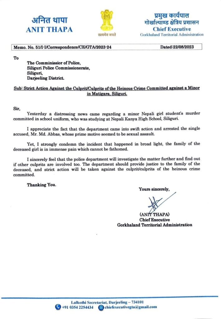 सिलगढी (निसं): सिलगढीको मतिगढा इलाकामा हिज सोमबार दिउँसै नेपाली स्कुलमा पढ्ने एकजना नाबालिकाको स्कुल ड्रेसमैं जघन्य हत्या भएको घटनालाई लिएर जीटीए प्रमुख कार्यपाल अनित थापाले कठोर शब्दमा निन्दा गर्नको साथै पिडित परिवारलाई शोक समवेदना प्रकट गरेका छन्। यसको साथै तिनले सिलगढी पुलिस कमिश्नरेटका पुलिस कमिशनरलाई पत्राचार गरेर उक्त घटनाको राम्ररी जाँच गरेर परिवार पक्षलाई उचित न्याय दिलाउने मांग पनि गरेका छन्। स्मरण रहोस, उक्त घटनामा हत्यारा 21 वर्षीय मोहम्मद अब्बासलाई पुलिसले मतिगढाको बलासन ब्रिज संलग्न लेलीन कलोनीबाट पक्राउ गरेको छ।