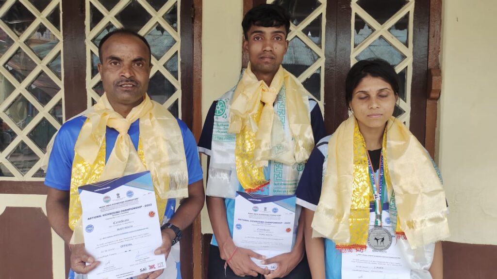 खरसाङ (निसं) : पञ्जाबमा सम्पन्न नेशनल किक बक्सिङ च्याम्पियनशीपमा भाग लिएर फर्केका खरसाङका दुईजना किक बक्सिङ खेलाडीलाई आज खरसाङमा स्वागत जनाइयो। पञ्जाबमा सम्पन्न नेशनल किक बक्सिङ च्याम्पियनशीप 2023 मा भाग लिएर सिल्भर मेडल र पाँचौँ स्थान प्राप्त गरेर फर्केका खरसाङका दुईजना बक्सिङ खेलाडी क्रमैले निशा रावत र निखिल रावत अनि कोच बिजय रावतलाई खरसाङमा स्वागत जनाइयो। पञ्जाबमा विगत 1 जुलाईदेखि 5 जुलाईसम्म सम्पन्न नेशनल किक बक्सिङ च्याम्पियनशीपमा निशा रावतले दोस्रो स्थान ओगटेर सिल्भर मेडल जित्न सफल भएकी छन् भने निखिल रावतले पाँचौँ स्थान ओगट्न सफल भएका छन्। दुवै खेलाडीलाई आज खरसाङको रेलवे स्टेशन परिसरमा हरिजन कल्याण समिति, खरसाङ गोर्खा पार्वत्य खेलकूद संघ, खरसाङका अन्य संस्थाहरू र मानिसहरूले स्वागत जनाउँदै संवर्द्धना जनाइयो।