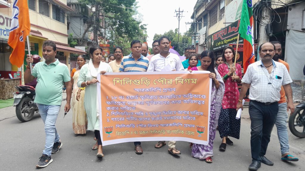 सिलगढी : पिउने पानीको समस्या समाधान लगायत विविध मागलाई लिएर आज भाजपाको 4 नम्बर मण्डल कमिटीका सदस्यहरूले सिलगढी नगरनिगम अभियान चलायो। नगरनिगमका विपक्षी नेता अमित जैनको नेतृत्वमा सिलगढीको बाघाजतीन पार्क संलग्न इलाकाबाट भाजपाको 4 नम्बर मण्डल कमिटीका सदस्यहरूले रैली शुरू गरेर नगरनिगम परिसर पुगेपछि पुलिसले ब्यारिकेड लगाएर उक्त रैलीलाई रोकिदियो। यसपछि अमित जैनको नेतृत्वमा 5 सदस्यको प्रतिनिधि टोलीले मेयर गौतम देवसित भेट गरेर एउटा ज्ञापन पत्र चढायो। भाजपाले उठाएको मागलाई गम्भीरतापूर्वक हेर्ने मेयर गौतम देवले आश्वासन दिएका छन्।