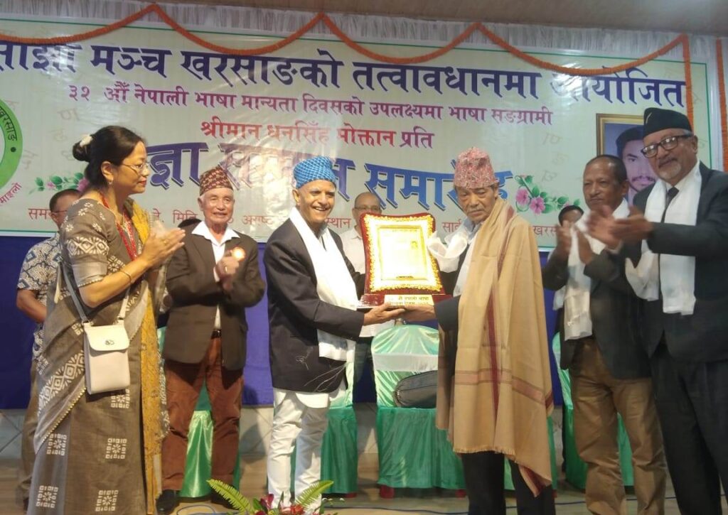 खरसाङ (निसं): गत वर्ष खरसाङमा स्थापना भएको प्रज्ञा साझा मञ्चले 32औँ नेपाली भाषा मान्यता दिवस तथा प्रज्ञा सम्मान कार्यक्रम आयोजना गर्यो। खरसाङको पार्क लोकेशनस्थित सार्वजनिक हलमा सम्पन्न उक्त कार्यक्रममा खरसाङका वरिष्ठ समाजसेवक नागरिक पण्डित तुलसी अधिकारी मुख्य अतिथिको रूपमा उपस्थित थिए। प्रज्ञा साझा मञ्चका अध्यक्ष रमेश थापाको अध्यक्षतामा सम्पन्न यस कार्यक्रममा दार्जिलिङ पहाडी भेकका सुपरिचित लेखक धनसिंह मोक्तानलाई दोस्रो प्रज्ञा सम्मानद्वारा सम्मानित गरियोl तिनले नेपाली भाषा मान्यताको आन्दोलनमा भूमिका निर्वाह गरेका थिएl नेपाली भाषा-साहित्य र भाषा आन्दोलनमा तिनले निर्वाह गरेको भूमिकालाई कदर गर्दै प्रज्ञा सम्मानद्वारा सम्मानित जनाइएको हो। दार्जिलिङ निवासी भाषा आन्दोलनका संग्रामी धनसिंह मोक्तानलाई नेपाली टोपी लगाइदिएर, शल ओढ्याएर, फुलको गुच्छा, कदर पत्र सहित स्मृति चिन्ह प्रदान गरेर मुख्य अतिथि, प्रज्ञा साझा मञ्चका अध्यक्ष, संरक्षक र विशिष्ट अतिथिको बाहुलीबाट सम्मान जनाइयो। सम्मान जनाउनअघि मञ्चका सदस्य प्रितम छेत्रीले तिनको परिचय प्रस्तुत गरे भने श्रीमती मीना राईले सम्मान पत्र पढेर सुनाइन्। रचना ‘अनाकार’–द्वारा सञ्चालित कार्यक्रममा प्रज्ञा साझा मञ्चकी सचिव उषाकिरण ‘सत्यदर्शी’–ले स्वागत भाषणमा मञ्चको उद्देश्य बारे संक्षिप्तमा बताइन्।