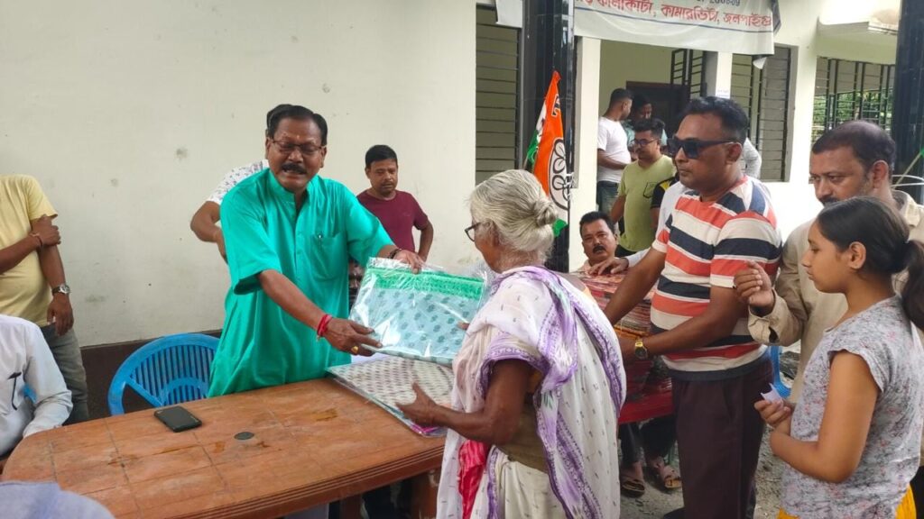 राजगञ्ज : दुर्गा पुजाको उपलक्ष्यमा तृणमूल कङ्ग्रेसका कार्यकर्ताहरूले आज 200 जना आवश्यकमन्द महिलाहरूलाई नयाँ लुगाफाटा वितरण गरे। आज राजगञ्ज ब्लकको बिन्नागढी ग्राम पञ्चायतको चकियाभिटा बुथ तृणमूल कङ्ग्रेसको तर्फबाट उक्त लुगाफाट वितरण गरिएको हो। आमबारी शक्तिसोपन क्लब मैदानमा एउटा कार्यक्रमको माध्यमद्वारा राजगञ्जका विधायक खगेश्वर रायले मानिसहरूलाई नयाँ लुगाफाटा वितरण गरे। यस अवसरमा तिनले भने, लगभग दस वर्षदेखि बिन्नागढी ग्राम पञ्चायतको चकियाभिटा बुथ तृणमूल कङ्ग्रेसको तर्फबाट पुजाको अवसरमा लुगाफाट वितरण गर्दै आइरहेको छ। यस वर्ष पनि आफूहरूलाई लुगाफाटा वितरण गर्नको लागि आमन्त्रित गरिएको हो। यस अवसरमा राजगञ्ज ब्लक तृणमूल कङ्ग्रेसका अध्यक्ष अरिन्दम ब्यानर्जी, राजग्ञ्ज ब्लक युवा तृणमूल कङ्ग्रेसका अध्यक्ष तुषार दत्त, पार्टी नेता विजय दास समेत स्थानीय पञ्चायत सदस्यहरू उपस्थित थिए।