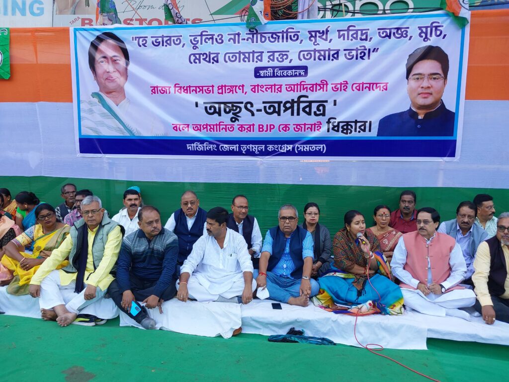 सिलगढी : राज्य विधानसभा परिसरमा बंगालका आदिवासी दाजुभाइ तथा दिदी–बहिनीहरूलाई “अछुत र अपवित्र” भनेर अपमान गरेको विरोधमा तृणमूलले सिलगढीमा धरना प्रदर्शन गर्यो। दार्जिलिङ जिल्ला तृणमूल कङ्ग्रेसका कार्यकर्ता तथा समर्थकहरूले आज हासमी चोक धरना प्रदर्शन गरे। यस अवसरमा दार्जिलिङ जिल्ला तृणमूल कङ्ग्रेसका सभानेत्री पापिया घोष, दार्जिलिङ जिल्ला तृणमूल कङ्ग्रेसका चेयरम्यान अलोक चक्रवर्ती लगायत दलका विशिष्ट नेतृत्वहरू उपस्थित थिए। यस अवधि दार्जिलिङ जिल्ला तृणमूल कङ्ग्रेसका कार्यकर्ता तथा समर्थकहरूले भाजपाको विरोधमा आवाज उठाउनको साथै राष्ट्रपतिको भूमिकालाई लिएर पनि प्रश्न चिन्ह खडा गरे। यसको साथै सभानेत्री पापिया घोषले आगामी दिनमा बुथ-बुथमा आन्दोलन गर्ने चेताउनी समेत दिएकी छन्।