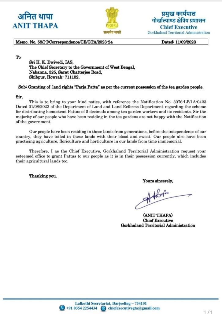 सिलगढी (निस): पार्टीको तेस्रो स्थापना दिवसको अवसरमा कालेबुङ मेला ग्राउन्डबाट घोषणा गरे अनुसार जीटीए प्रमुख कार्यपाल अनित थापाले चियाकमानवासीको सम्पूर्ण जमीनको पट्टाको मांग गर्दै पश्चिम बङ्गाल सरकारका मुख्य सचिव एचके दुवेदीलाई पत्राचार गरेका छन्।