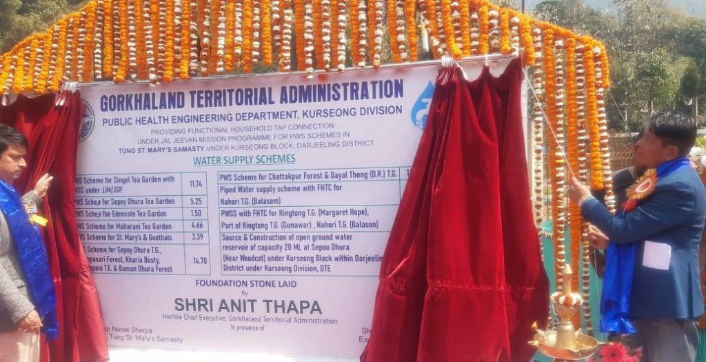 सोनादा (निसं) : खरसाङ महकुमा अन्तर्गत टुङ सन्त मेरिज समष्टिको लागि जीटीएबाट 1 सय 22 करोड़ बराबरको लागतमा पिउने पानीको परियोजनाको शिलान्यास गरियो। उक्त शिलान्यास कार्यक्रमको अध्यक्षता मनिष तामाङले गरेका थिए भने कार्यक्रममा प्रमुख अतिथिको रूपमा जीटीएको मुख्य कार्यपाल अनित थापा उपस्थित थिए। उक्त शिलान्यास कार्यक्रम टुङ सन्त मेरिज समष्टिको बेलटारमा जीटीए चिफ अनित थापाको बाहुलीबाट सम्पन्न गरियो। हिल तराई डुवर्स प्लान्टेशन वर्कर्स युनियन खरसाङ महकुमा समितिका सचिव भक्तिमान तामाङले सञ्चालन गरेको उक्त शिलान्यास कार्यक्रममा स्वागत सम्भाषण टुङ सन्त मेरिज समष्टिका सभासद नुरी शेर्पाले राखेका थिए।